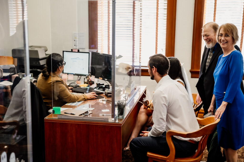 You’ll check in, have your ceremony performed by a deputy clerk, sign paperwork, and be legally married — all without the chaos of a big wedding day timeline.